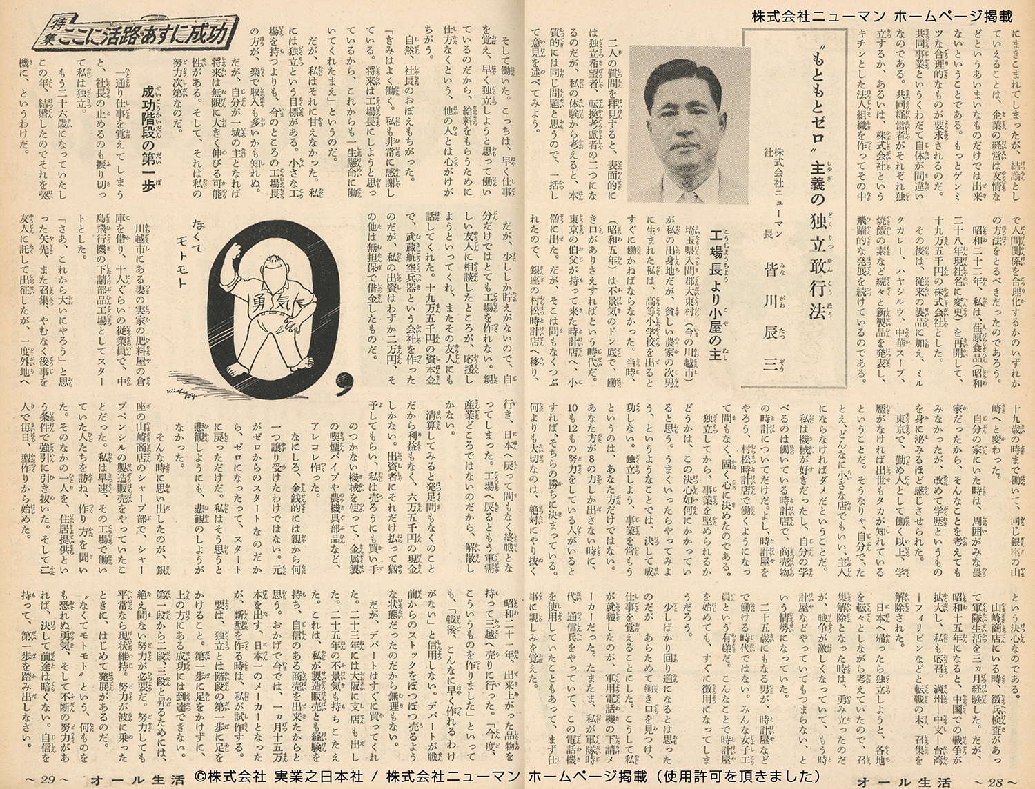 経済誌『オール生活』の取材に対して、その冒頭で、「新規に独立を希望する者と、事業の転換を考慮する者と、本質的には同じである」として、一括して”独立敢行法”を伝えています。それは、まさに0からの創業と、第二創業を一人で行った自身の経験に裏打ちされた回答だったと言えます。